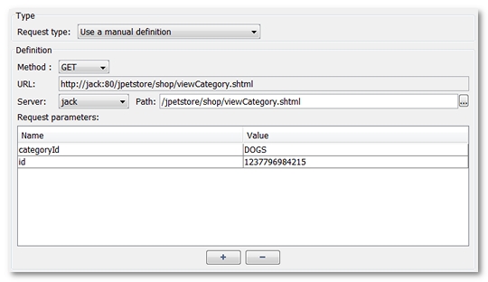 In this amended definition, Neotys Design Studio has changed the request manual definition into a Link Extractor by setting the parameter id as a dynamic parameter (value <MUST BE PRESENT>). Furthermore, Neotys Design Studio will place the value of this dynamic parameter into the variable id when the scenario is run so the variable can be used later on in the scenario.