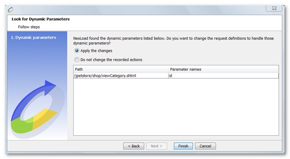 During a dynamic parameter search, Neotys Design Studio fails to find this exact link in the server response. However, it will find an identical link with a new value for parameter id. Consequently, Neotys Design Studio offers to manage this dynamic parameter in your scenario:
