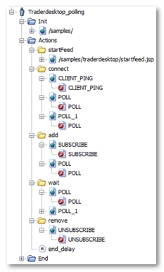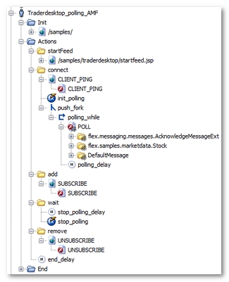 POLL for example). This request has been placed in a loop (polling_while for example), which continues to loop until the NL-stopPolling variable generated by Neotys Design Studio becomes true. Lastly, the loop itself has been placed in a secondary execution thread using a fork action (push_fork for example). For more information, see Polling requests.(flex.samples.marketdata.Stock or flex.messaging.messages.AcknowledgeMessageExt for example).init_polling initializes the NL-stopPolling variable, with the false value, to have the polling function work on every Virtual User iteration.polling_delay is the average of the time intervals between two polling requests in the original User Path.stop_polling variable modifier triggers the exit from the polling loop by modifying the value of the NL-stopPolling variable.