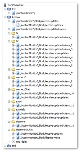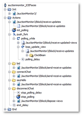 XXX/receive-updated-views on the one hand and those with the form XXX/receive-updates on the other hand. This reduces the number of requests considerably. If a Container becomes empty (as is the case with bi and connec here for example), it is automatically deleted. For more information, see Polling requests.viewsToUpdate has been placed on the first polling request (/auctionMonitor3/block/receive-updated-views for example), which retrieves the id's for the ICEfaces views to be updated. This is why the second polling request has been placed in a loop (loop_update_view for example), in order to issue an update request for each previously-extracted view.(/auctionMonitor3/block/receive-updates for example) has been placed in a loop (polling_while), which continues to loop until the NL-stopPolling variable generated by Neotys Design Studio becomes true. Lastly, the loop itself has been placed in a secondary execution thread using a fork action (push_fork for example).polling_delay polling delay is the average of the time intervals between two polling requests in the original User Path.init_polling initializes the NL-stopPolling variable, with the false value, to have the polling function work on every Virtual User iteration.stop_polling variable modifier stops the polling loop by modifying the value of the NL-stopPolling variable.