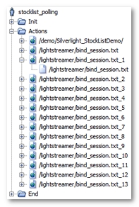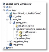polling_while for example), which continues to loop until the NL-stopPolling variable generated by Neotys Design Studio becomes true. Lastly, the loop itself has been placed in a secondary execution thread using a fork action (push_fork for example). For more information, see Polling requests.init_polling initializes the NL-stopPolling variable, with the false value, to have the polling function work on every Virtual User iteration.initialSnapshot-1 or update-1 for example).initialSnapshot-X, update-X and heartbeat, where X represents the updated HTML component.LS_phase parameter is handled using the LS_phase Variable Extractor set both on the session creation request (creation_session.js for example) and on the Push request (/lightstreamer/bind_session.txt for example). A JavaScript action (LS_phase_update1 for example) increments the value of the LS_phase variable at each loop iteration to reproduce the browser behavior.polling_delay polling delay is the average of the time intervals between two polling requests in the original User Path.stop_polling variable modifier stops the polling loop by modifying the value of the NL-stopPolling variable.