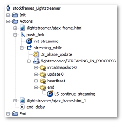 /lightstreamer/STREAMING_IN_PROGRESS for example) has been placed in a loop (streaming_while for example), which continues to loop until the LS_end_streaming variable generated by Neotys Design Studio becomes true (the streaming request can be executed several time if the length of the response is over 300 Kb). Lastly, the loop itself has been placed in a secondary execution thread using a fork action ( push_fork for example).init_streaming initializes the LS_end_streaming variable, with the false value, to have the streaming function work on every Virtual User iteration.initialSnapshot-0 or update-0 for example). The end message is added to the streaming request to handle several executions of the streaming request (if the response length is over 300 Kb).initialSnapshot-X, update-X and heartbeat, where X represents the updated HTML component.LS_phase parameter is handled using the LS_phase Variable Extractor set on the session creation request (creation_session.js for example). A JavaScript action (LS_phase_update for example) increments the value of the LS_phase variable to reproduce the browser behavior. Lastly, this variable is used in the open streaming request (/lightstreamer/STREAMING_IN_PROGRESS for example).
