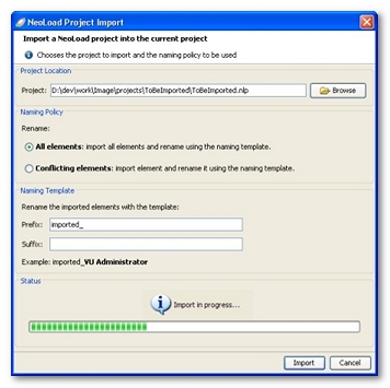 6. The import begins; in the event of a naming conflict, a pop-up window allows you to change the name of a resource if the name already exists.