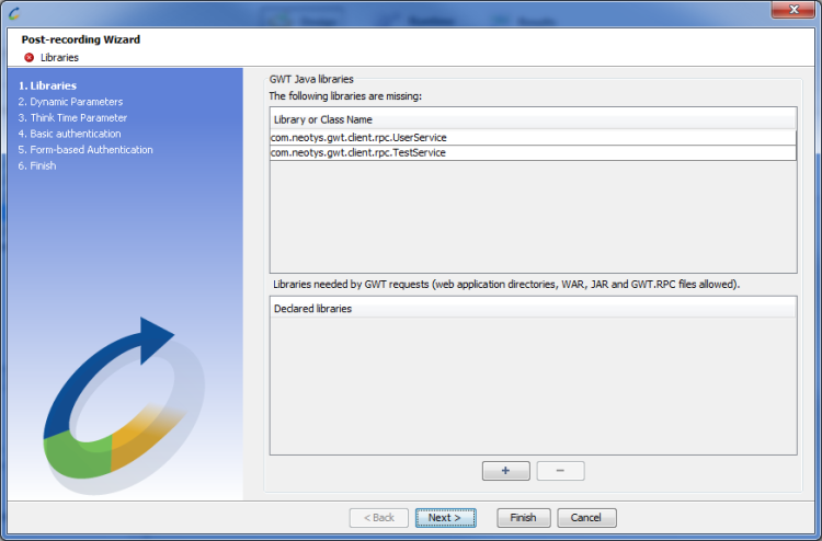 Some web applications, for example those using the Adobe Flex/AMF, Adobe RTMP, GWT and Java Serialization technologies, require Java libraries to be declared in order to play back the User Path requests correctly. Refer to the Requests section for more details on the Post-recording wizard for each technology.