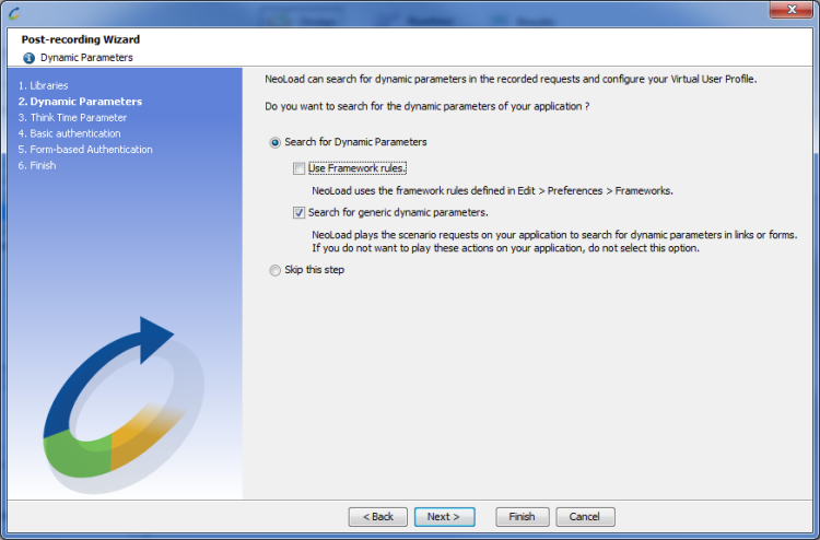 Dynamic parameter handling. Certain form or request parameters are server-generated and must be extracted from the server response during the test. This step detects and automatically configures these dynamic parameters. For more information, see Frameworks.