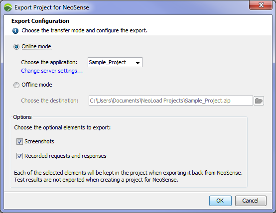 Select the optional elements to export: Screenshot and/or Recorded requests and responses if you want to retrieve your project as is from NeoSense to NeoLoad.