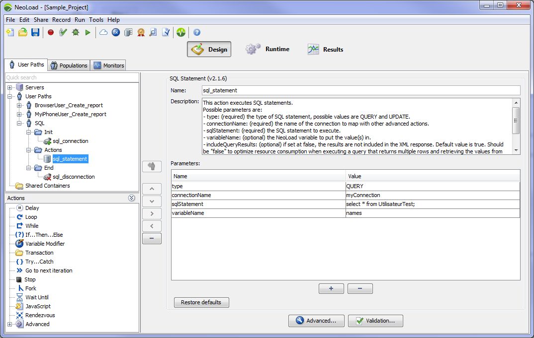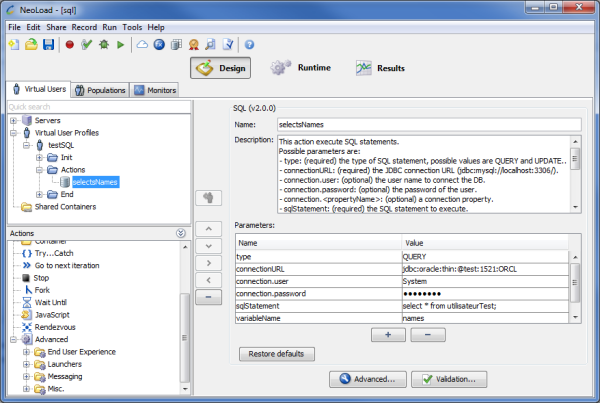 The SQL Statement Advanced action executes SQL statements. It enables you to perform administrative tasks like cleaning a database after a test. It also allows you to get business-related metrics that you can monitor, for example the number of items in a work queue or the number of checkouts during the last minute.