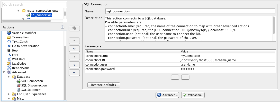 jdbc:db2://host:50000/dbmy_user_namemy_passwordcom.ibm.db2.jcc.DB2DriverThe SQL Disconnection Advanced action closes a previously opened database connection.