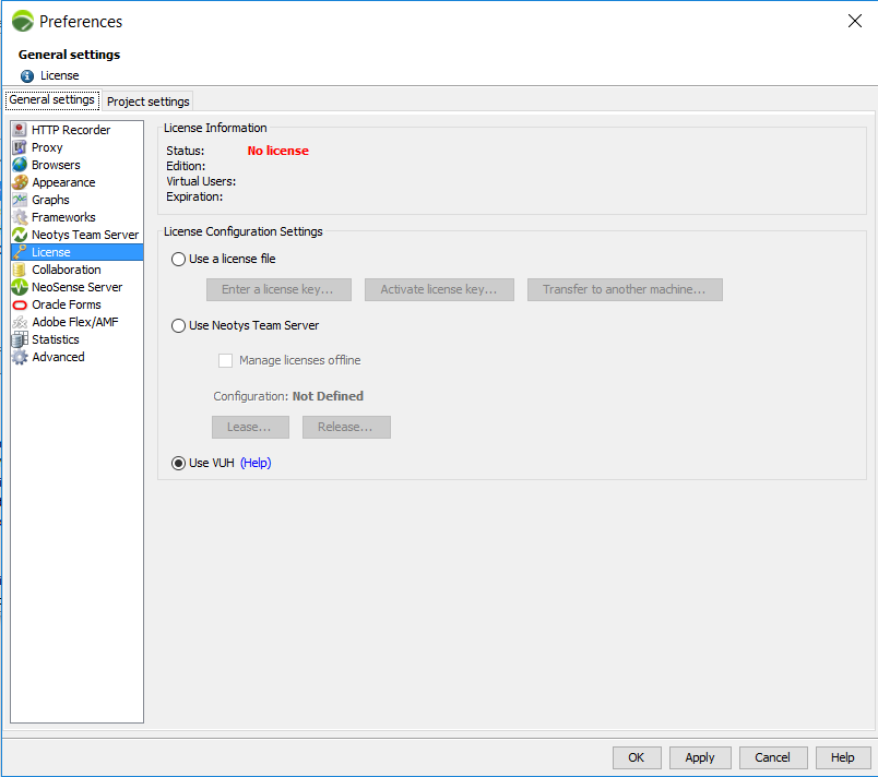 The VUH mode is activated in NeoLoad with the license management tool. Choosing Help > License management > License section gives access to the Use VUH option.