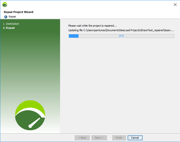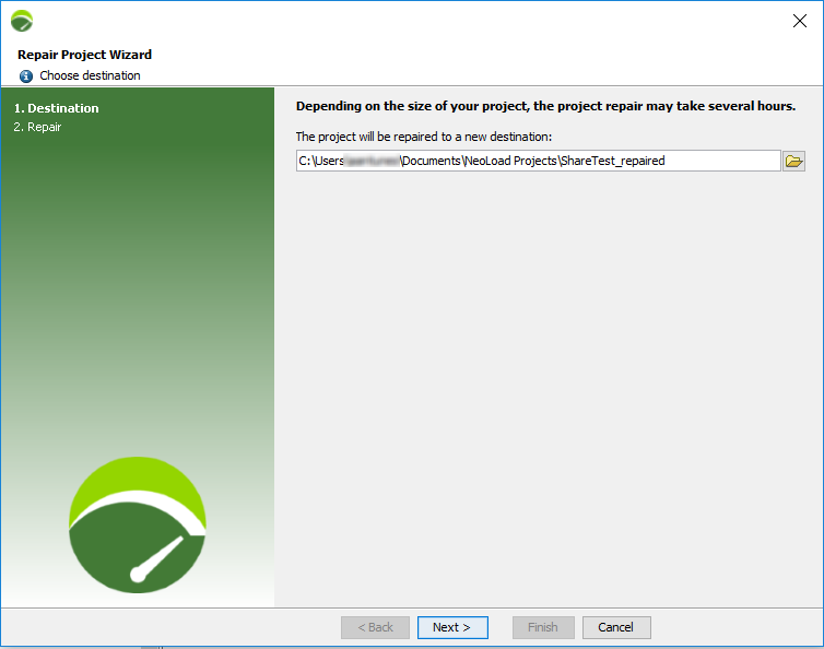 Repairing a collaborative project is useful when NeoLoad fails to publish or update your project onto the server. Collaboration operations can be blocked because of SVN metadata corruption. In that case, it may be useful to try repairing your project while keeping your local modifications. The repair function creates a backup copy of the original project and renames it by appending "_repaired" to the project name.