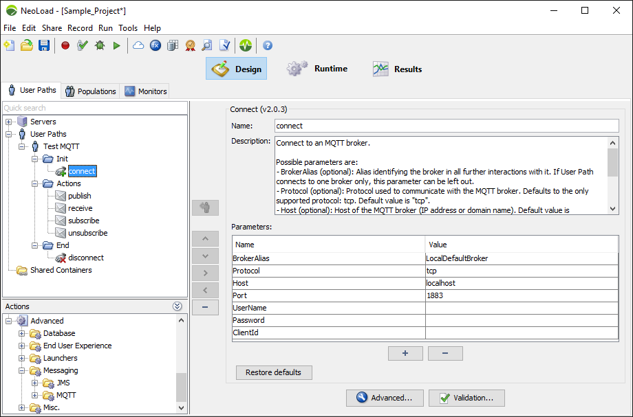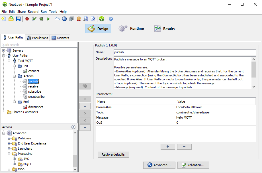 An example publishing on the ‘/neotys.com/share/news/’ topic using the connection associated to the ‘LocalDefaultBroker’ alias:
