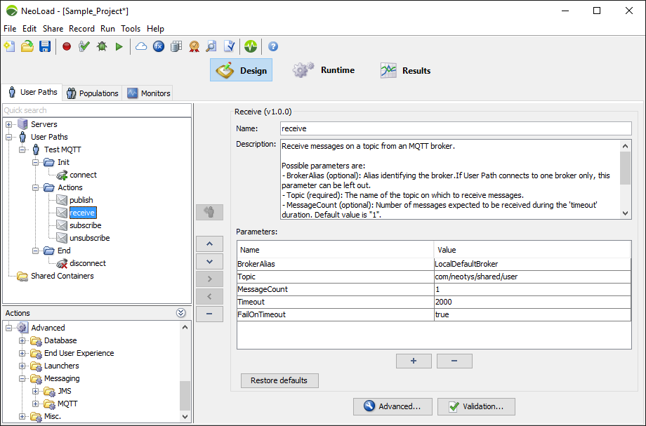 An example of receiving messages on the ‘/neotys.com/share/news/’ topic using the connection associated to the ‘LocalDefaultBroker’ alias and expecting to receive at least 10 messages in 30 seconds, if this contract is not met the action will fail: