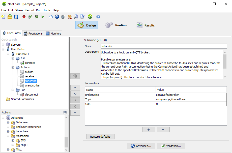 An example subscribing to the ‘/neotys.com/share/news/’ topic with a default QoS value of "0" and using the connection associated to the ‘LocalDefaultBroker’ alias: