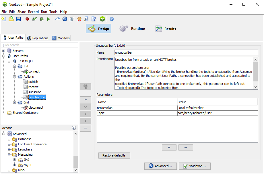 An example unsubscribing from the ‘/neotys.com/share/news/’ topic on the connection associated to the ‘LocalDefaultBroker’ alias.
