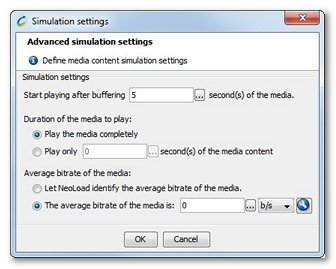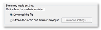 A media request can defined to simulate the media playback when the Stream the media and simulate playing it option is selected in the Streaming media settings group box. A click on the Simulation settings button displays the dialog to specify the request simulation parameters.