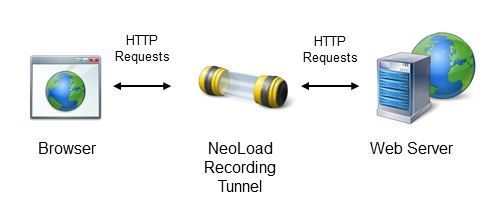 The communication between the browser and the server is recorded through the Neotys Design Studio tunnel function which makes it possible to launch the Neotys Design Studio recorder without using the Neotys Design Studio proxy. On one side, the tunnel simulates the web server for the browser, and on the other side, it processes the requests and responses with the web server. The recorder catches the transactions to build the scenario. Neotys Design Studio allows filtering the recording and skipping or including some requests to get an accurate scenario.