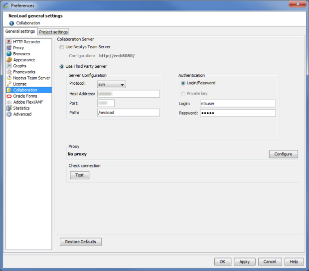 Configuring the connection to a collaboration server consists in specifying the location where collaborative projects are shared and how to access it.