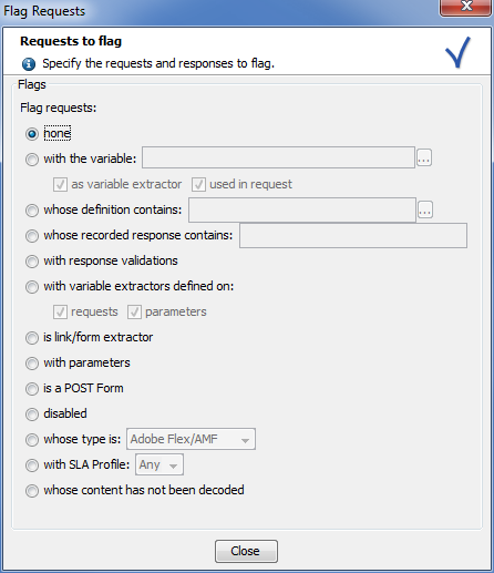 A flag is used to identify requests that fulfill certain criteria. When a request fulfilling criteria has been identified, a tick mark appears next to the request icon in the User Path tree. Any Container (Transaction, Loop, User Path, etc.) containing a flagged item is itself flagged.
