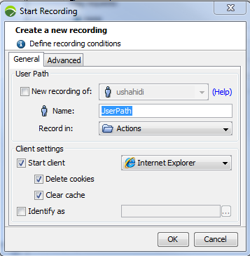 Starting a new recording creates a new User Path and places all the web pages visited during the recording into that User Path. At the beginning of the recording, the cookies may be deleted and the browser cache may be cleared.