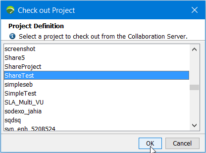 To check out the remote project, Neotys Design Studio 5.5 must be started. The Welcome to Neotys Design Studio 5.5 screen is displayed. To check out a project, the Share > Check Out Project command must be chosen. The list of the projects shared on the collaboration server is displayed.