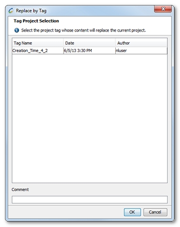 Replacing a project with the content of one of its tags is useful to come back to a version which has been recorded in a previous tag process. The current content is removed and replaced by the content of the tagged project. Contrarily to retrieving a tag, replacing a project overwrites the current project which is still shared.
