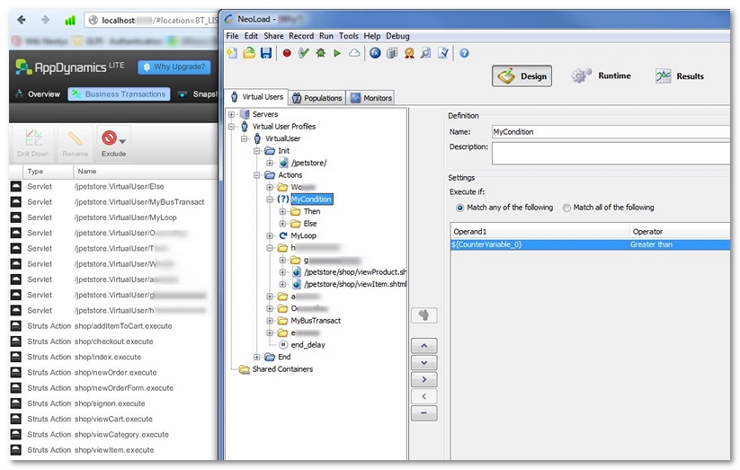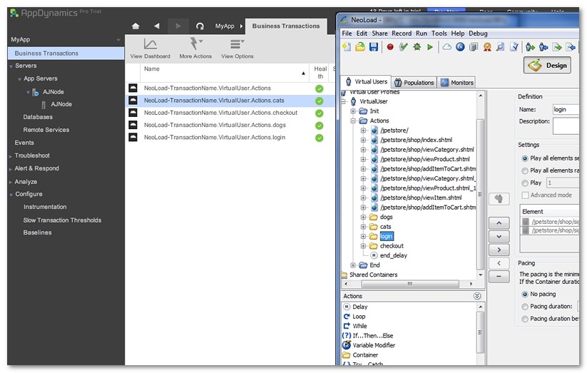 When the AppDynamics/Neotys Design Studio integration module is configured and when the Neotys Design Studio naming settings are declared in AppDynamics, starting a load test in Neotys Design Studio displays the business transactions in AppDynamics. AppDynamics monitors business transactions to determine the health of the application with metrics.