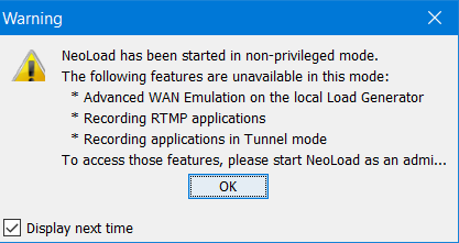When started in non-privileged mode, Neotys Design Studio 5.5 displays a message box to warn that some Neotys Design Studio 5.5 functions are unavailable: