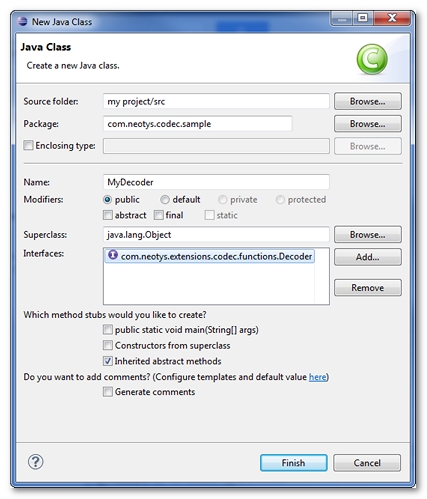 In Eclipse, a class must be created to implement the interface com.neotys.extensions.codec.functions.Decoder.