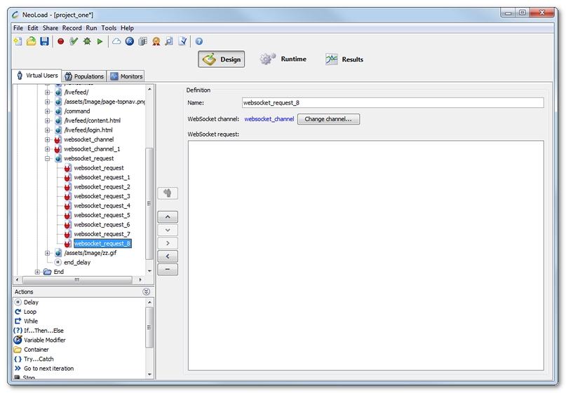 WebSocket channel: Because a WebSocket action requires a WebSocket channel, Neotys Design Studio automatically associates the first channel found in the scenario. The associated channel is displayed as a link to access it directly in the design view. When there is no channel available or when it is necessary to assign another channel, a click on the Change channel button makes it possible to select another channel.