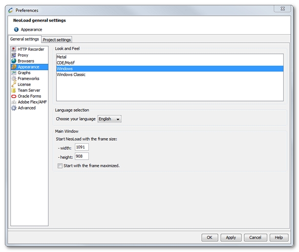 Neotys Design Studio makes it possible to change the look of Neotys Design Studio and the language used. The program must be restarted for changes to take effect.