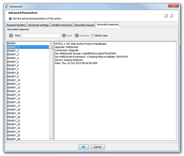 By definition, a WebSocket channel contains a number of server responses. The browser issues a single request and, in return, receives several updates. In the WebSocket channel advanced section, the Recorded response tab shows a list of all the responses received.