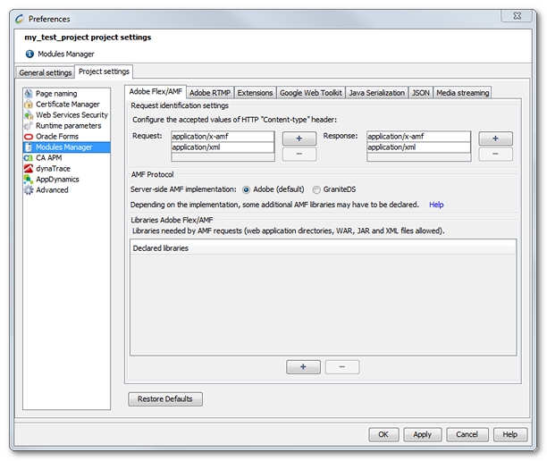 Adobe Flex/AMF project preferences allow declaring/deleting AMF libraries on-the-fly, without the need to restart Neotys Design Studio.