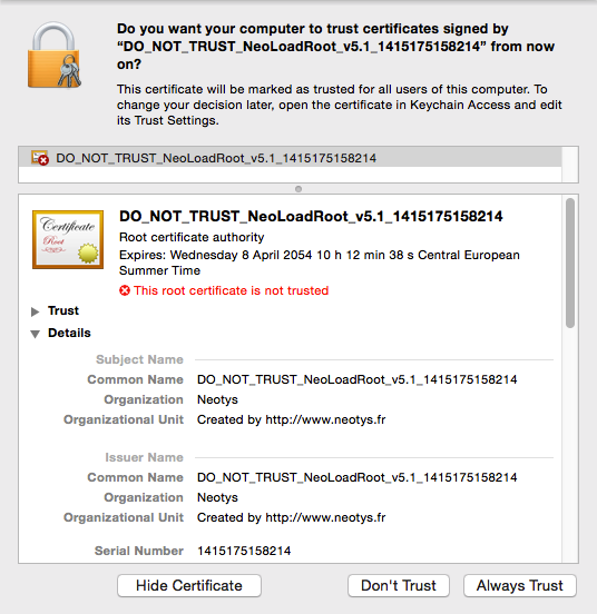 Installing the Neotys Design Studio Certificate Authority certificate (NeoLoad_Root_CA.cer) in the browser certificate authority keystore enables each certificate generated during an SSL recording to be authenticated, thus preventing the certificate error messages in the browser. For more information about the Neotys Design Studio Certificate Authority certificate, see Root certificate.