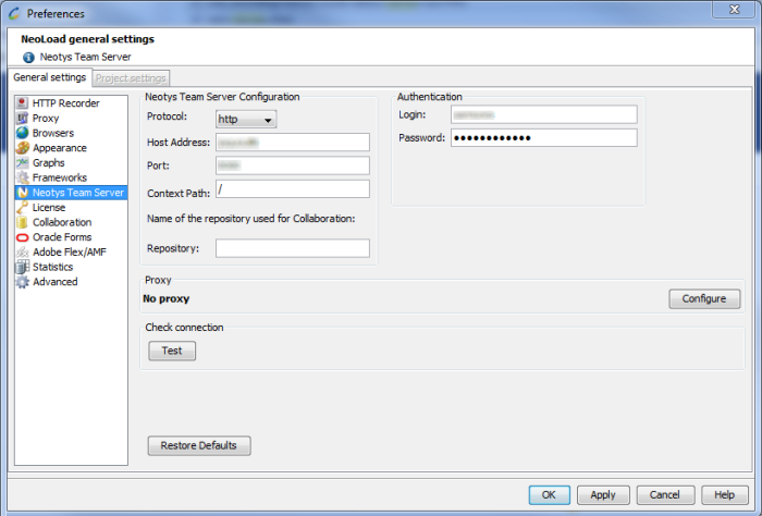 In the Proxy group box: When necessary, select the proxy you want to use to connect to Neotys Team Server in HTTP or HTTPS mode. For more information, see Proxy.