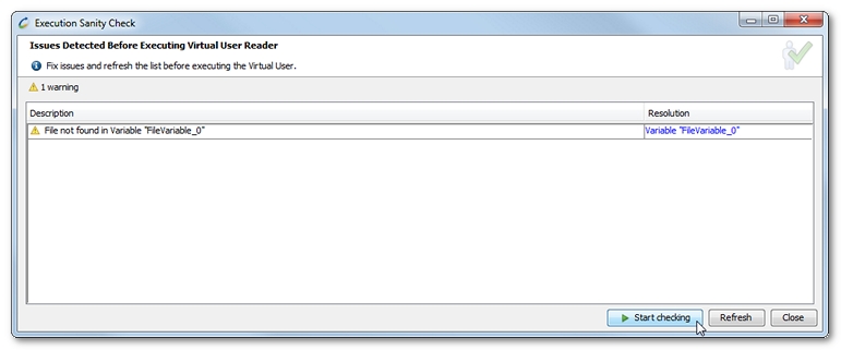 In the Check User Path dialog, a click on the Start checking button launches a mock execution of the Virtual User. When inconsistencies in the Virtual User design are detected, the Execution Sanity Check dialog may pop up, which makes it possible to correct them preventively.