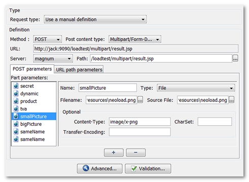 The Filename field describes the file name within the part. The part content data is described by the Source File field. The file may be identified using a set path or one related to the project. The files are automatically copied to all the Load Generators when the test is started.
