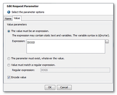 The name may contain plain text or a Neotys Design Studio variable. When the Encode name box is checked, the specified name is encoded in MIME application/x-www-form-urlencoded format before being submitted (e.g. spaces are encoded as %20). Clear the check box if the name is already encoded.