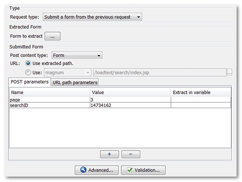 Extracts and submits a form from a form in the previous request. This option should be used when a scenario includes the submission of a form containing a dynamic hidden field. The form from the results of the preceding request (referrer) are dynamically extracted, allowing the dynamically extracted values to be submitted.