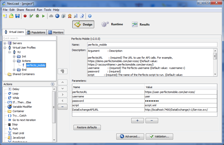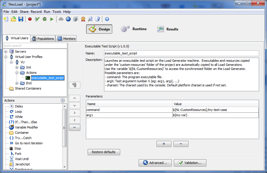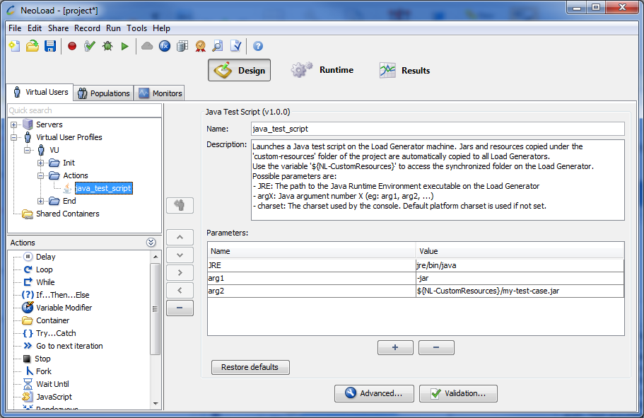 Warning: The default JRE used by the Java Test Script Advanced action is the JRE of Neotys Design Studio. If you are using NeoLoad 64-bit and if a 32-bit JRE is required for the libraries of the third-party tool you are using (such as Jamo), make sure to install a 32-bit JRE on the machine and update the JRE parameter to point to the correct JRE.