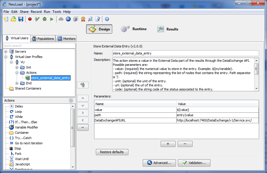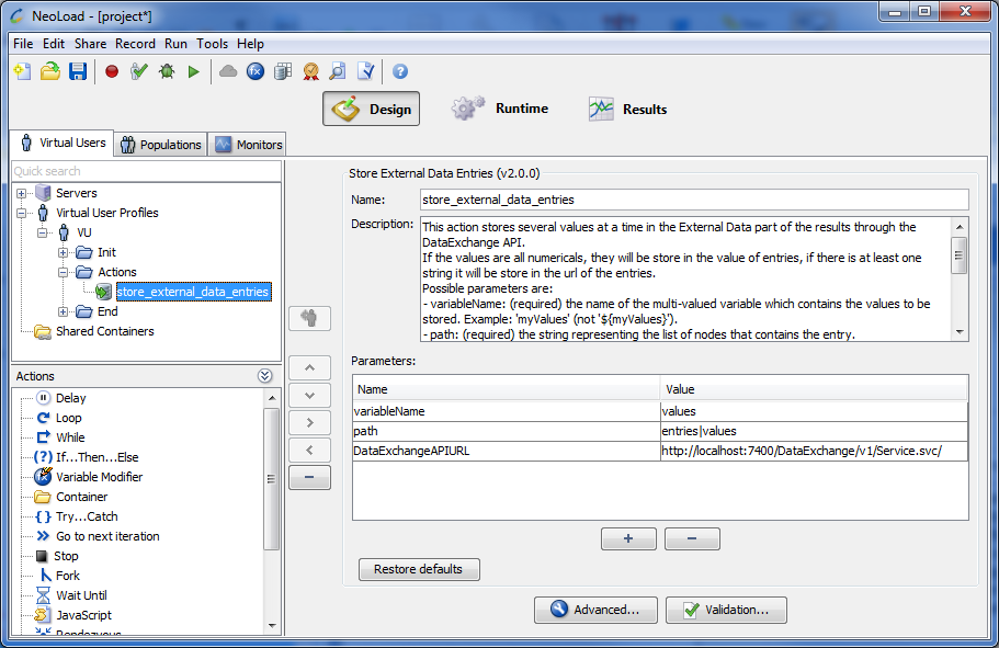The Store External Data Entries Advanced action stores several values at a time using the Data Exchange API. Theses values are referred to as “External Data” in the Runtime and Results tabs. A typical use is to grab business-related metrics through a Variable Extractor or through the SQL action and store them for later analysis. The entry values can be structured in a tree by specifying different paths in the path parameter.