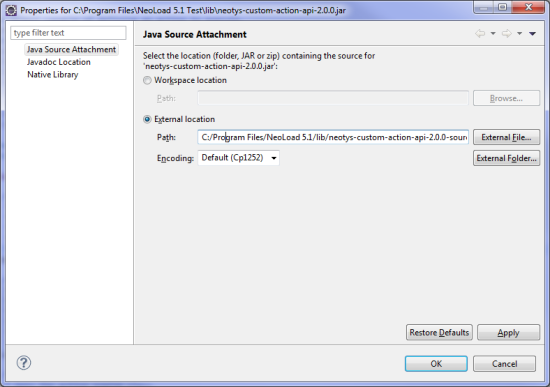 This section describes how to attach in Eclipse the sources of the public API provided. The sources are provided in the NeoLoad installation directory as a JAR file: