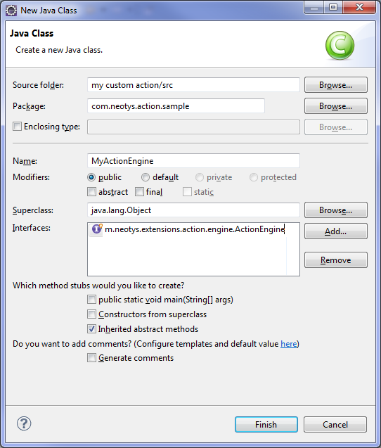 MyActionEngine. - Click Finish to validate the new