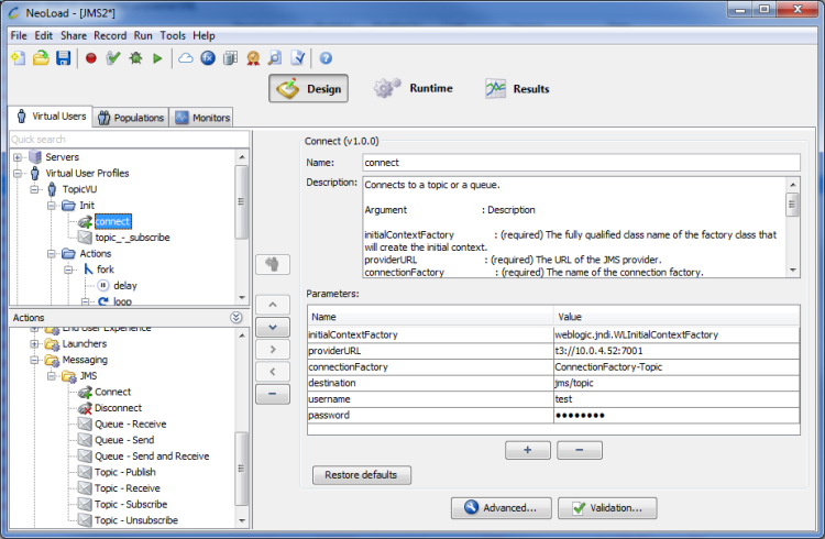 com.tibco.tibjms.TibjmsQueueConnectionFactoryssl://tibco.example.com:7222SSLQueueConnectionFactorymyQueueNameuserNamepasswordcom.tibco.tibjms.naming.security_protocol=ssl,com.tibco.tibjms.naming.ssl_enable_verify_host=true,com.tibco.tibjms.naming.ssl_enable_verify_hostname=false,com.tibco.tibjms.naming.ssl_trusted_certs=${NL-CustomResources}/my_certificate.cercustom-resources' folder of the NeoLoad project. The ressources contained in this folder are automatically pasted into the Load Generators. The ${NL-CustomResources} variable is used to access this folder from the Load Generators.An example of connecting to a Oracle Weblogic topic:
