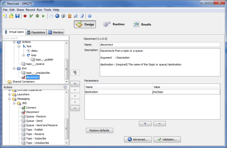 The Connect JMS Advanced action is used to connect to a topic or a queue.