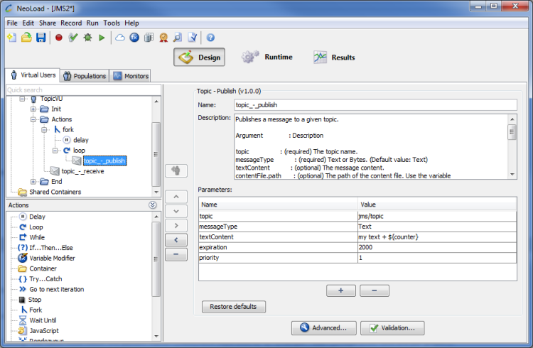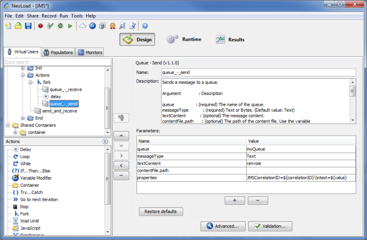 '${NL-CustomResources}' to access on the Load Generator the synchronized resources located in the 'custom-resources' folder of the project.DeliveryMode.NON_PERSISTENT.size=[Integer]150.Tip: Click the pencil icon