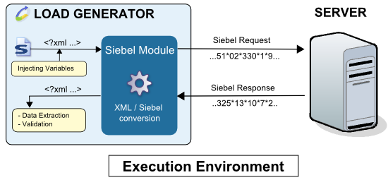 The variables in the XML request are calculated and the module engine converts the XML into a Siebel request and the data is then sent to the server. The Siebel response received is converted into XML, after which the validations and Variable Extractors in the played request are executed.