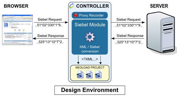 The data exchanged between the client and server transit through the recording proxy. It is during this transit that the Siebel module analyzes and decodes the requests. Once they have been converted into XML, the requests are inserted in the project.