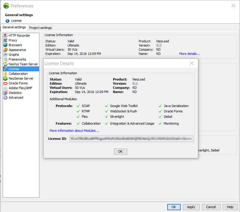 For every loaded, activated, or reserved license key, the License Information section provides the main properties about the license. When necessary, a click on the More details link displays the comprehensive list of the authorized modules associated with the license.