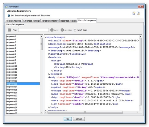 At the end of a recording using a Push framework, Neotys Design Studio creates a copy of the recorded User Path. This copy is modified so that the polling requests can be handled correctly. For more information, see Push frameworks. A single, special request replaces all the polling requests captured in the recording containing all the responses received for each polling request. In a polling request Advanced section, the Recorded response tab shows a list of all the responses received.