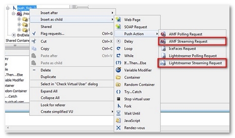 You may create a streaming request manually in the interface by right-clicking on a request Container and selecting Insert as child > Push Action > <Framework> request.